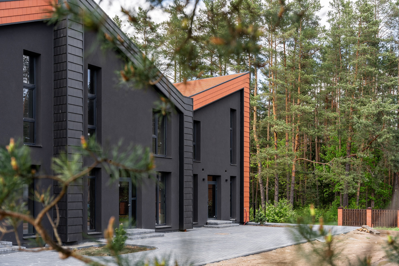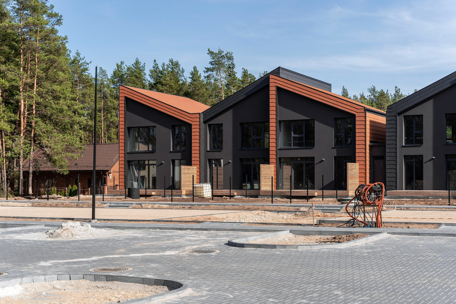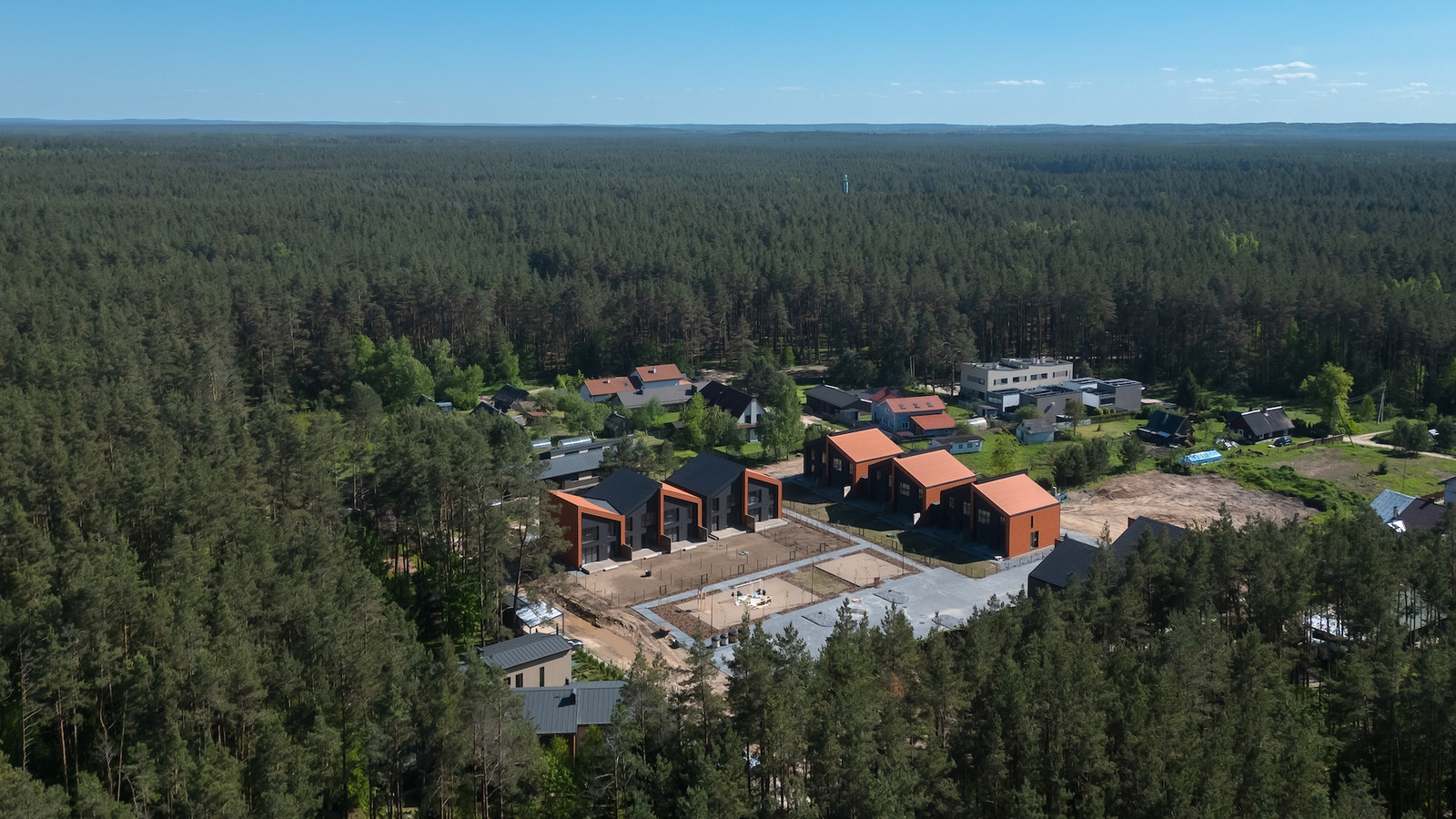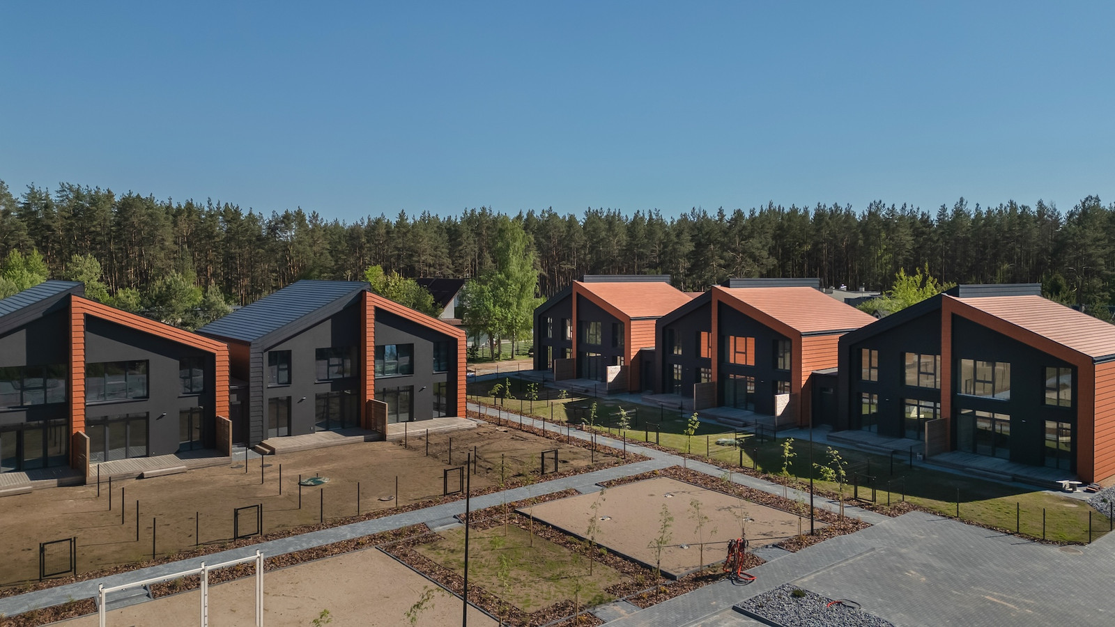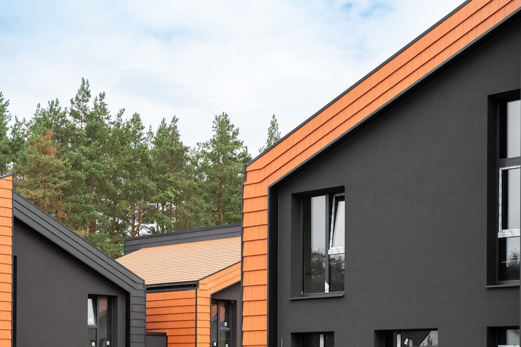 Projektui unikalumo suteikia inovatyvūs statybų sprendimai: namų fasaduose ir stoguose naudojamos dviejų spalvų - juodos ir molio - keraminės vokiškos čerpės suteiks namams ilgaamžiškumo, o gamtos unikalumą Jūsų interjere pabrėš medinio profilio, antracito spalvos vitrininiai langai, atveriantys pušyno žavesį.