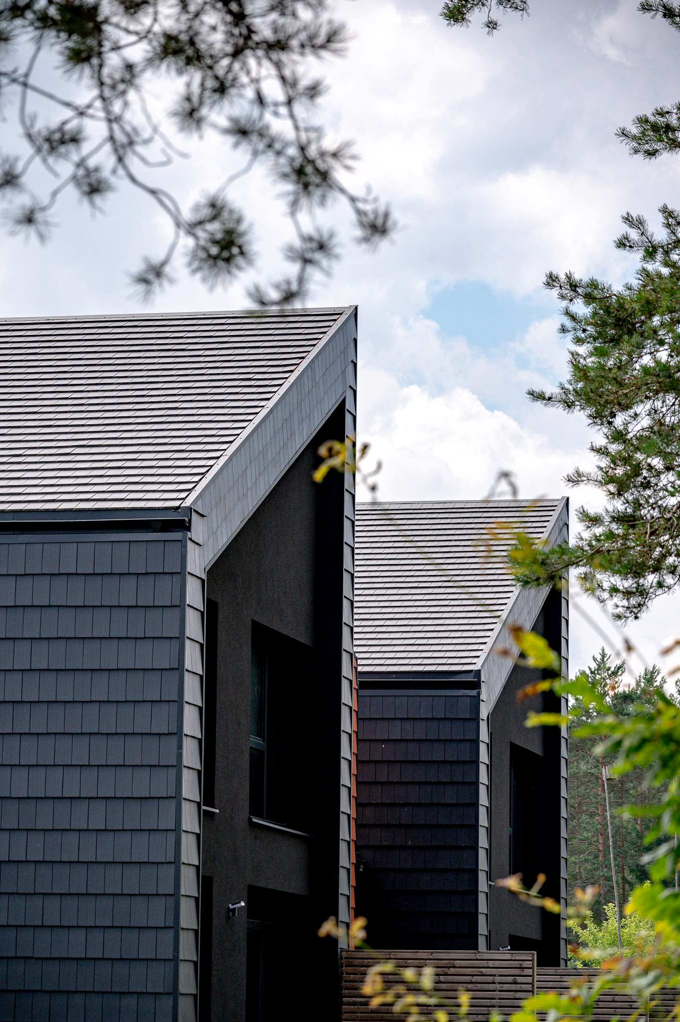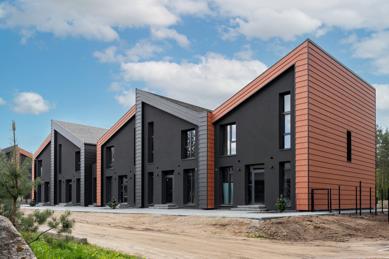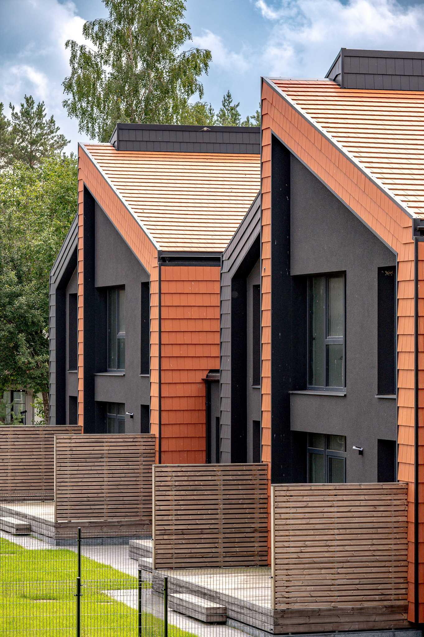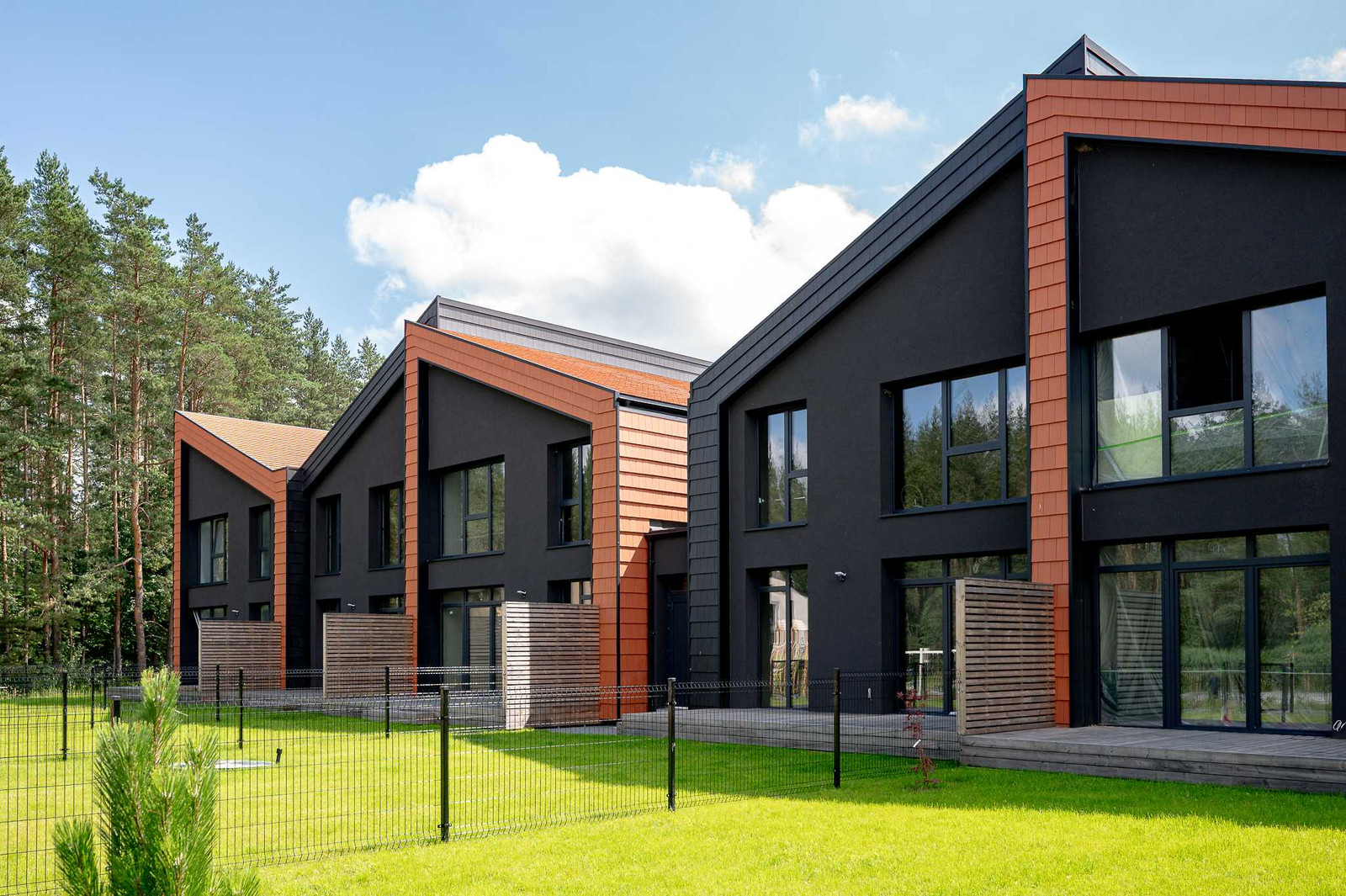 Projektui unikalumo suteikia inovatyvūs statybų sprendimai: namų fasaduose ir stoguose naudojamos dviejų spalvų - juodos ir molio - keraminės vokiškos čerpės suteiks namams ilgaamžiškumo, o gamtos unikalumą Jūsų interjere pabrėš medinio profilio, antracito spalvos vitrininiai langai, atveriantys pušyno žavesį.
