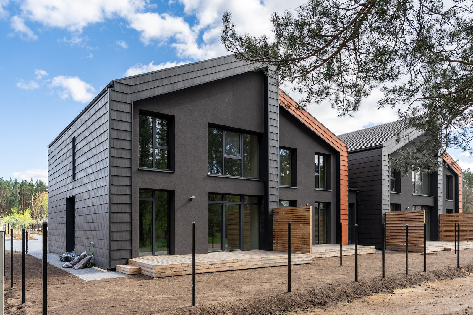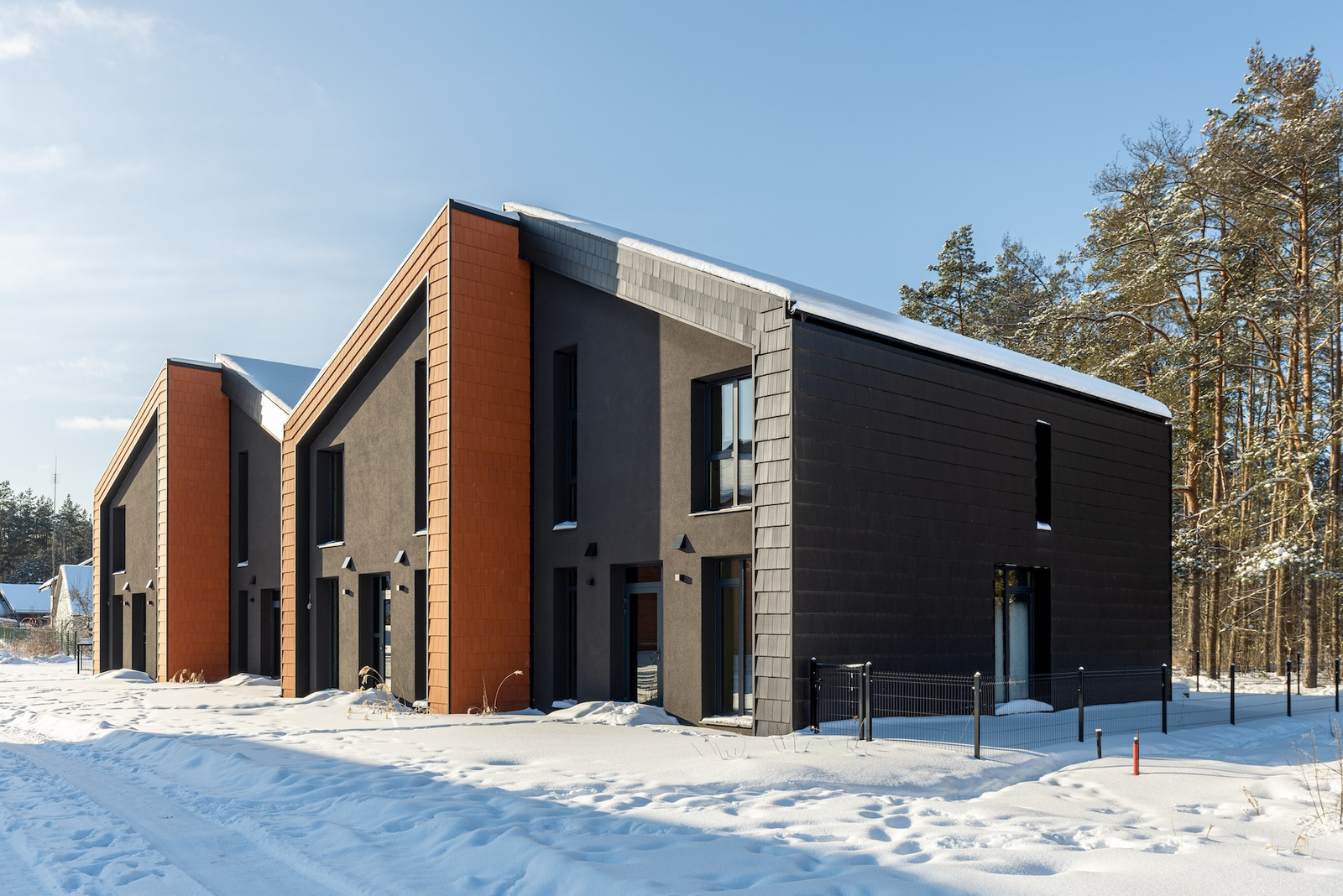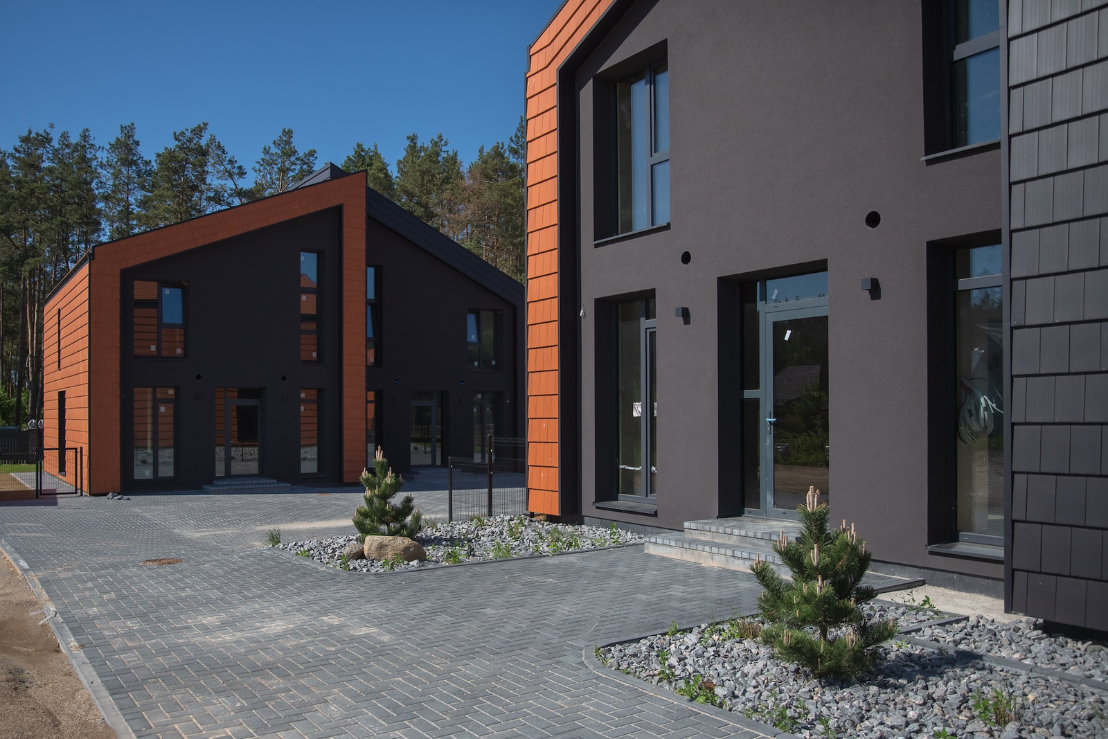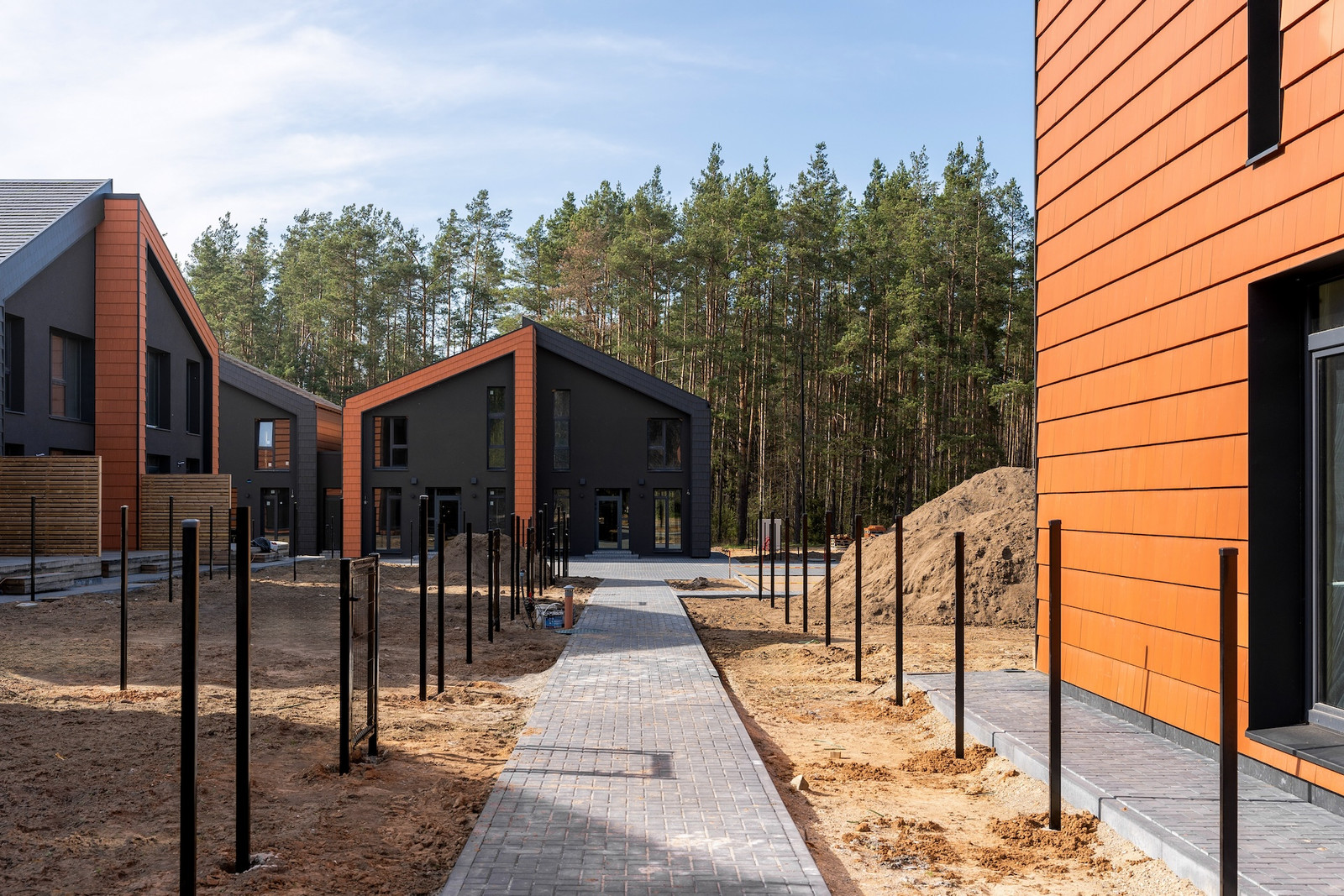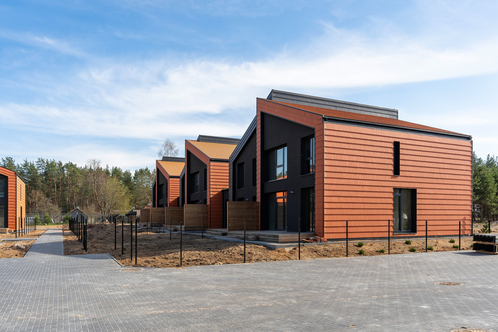 Projektui unikalumo suteikia inovatyvūs statybų sprendimai: namų fasaduose ir stoguose naudojamos dviejų spalvų - juodos ir molio - keraminės vokiškos čerpės suteiks namams ilgaamžiškumo, o gamtos unikalumą Jūsų interjere pabrėš medinio profilio, antracito spalvos vitrininiai langai, atveriantys pušyno žavesį.