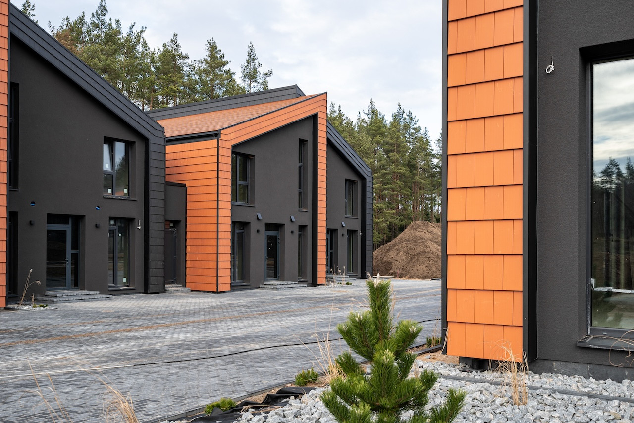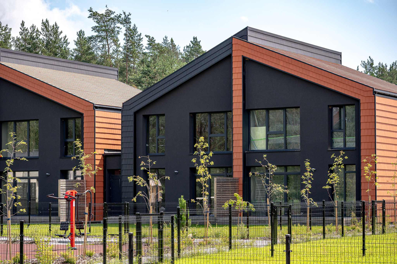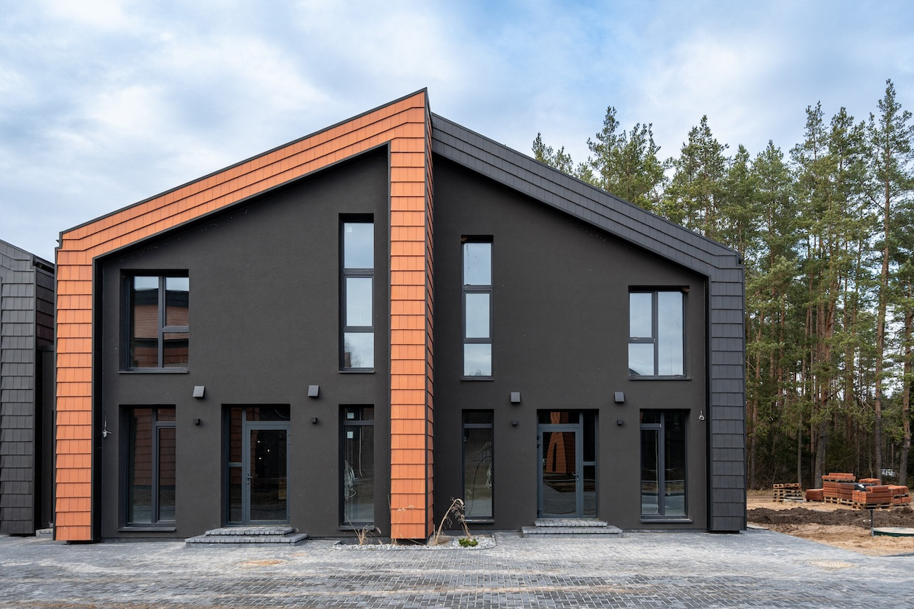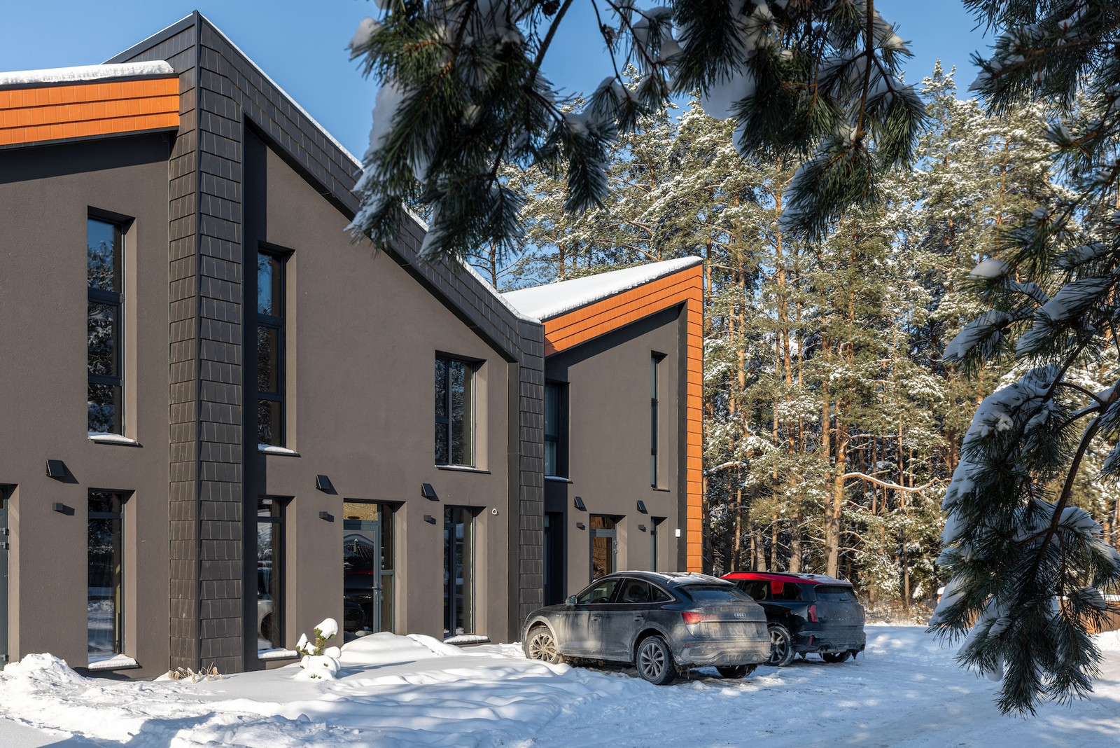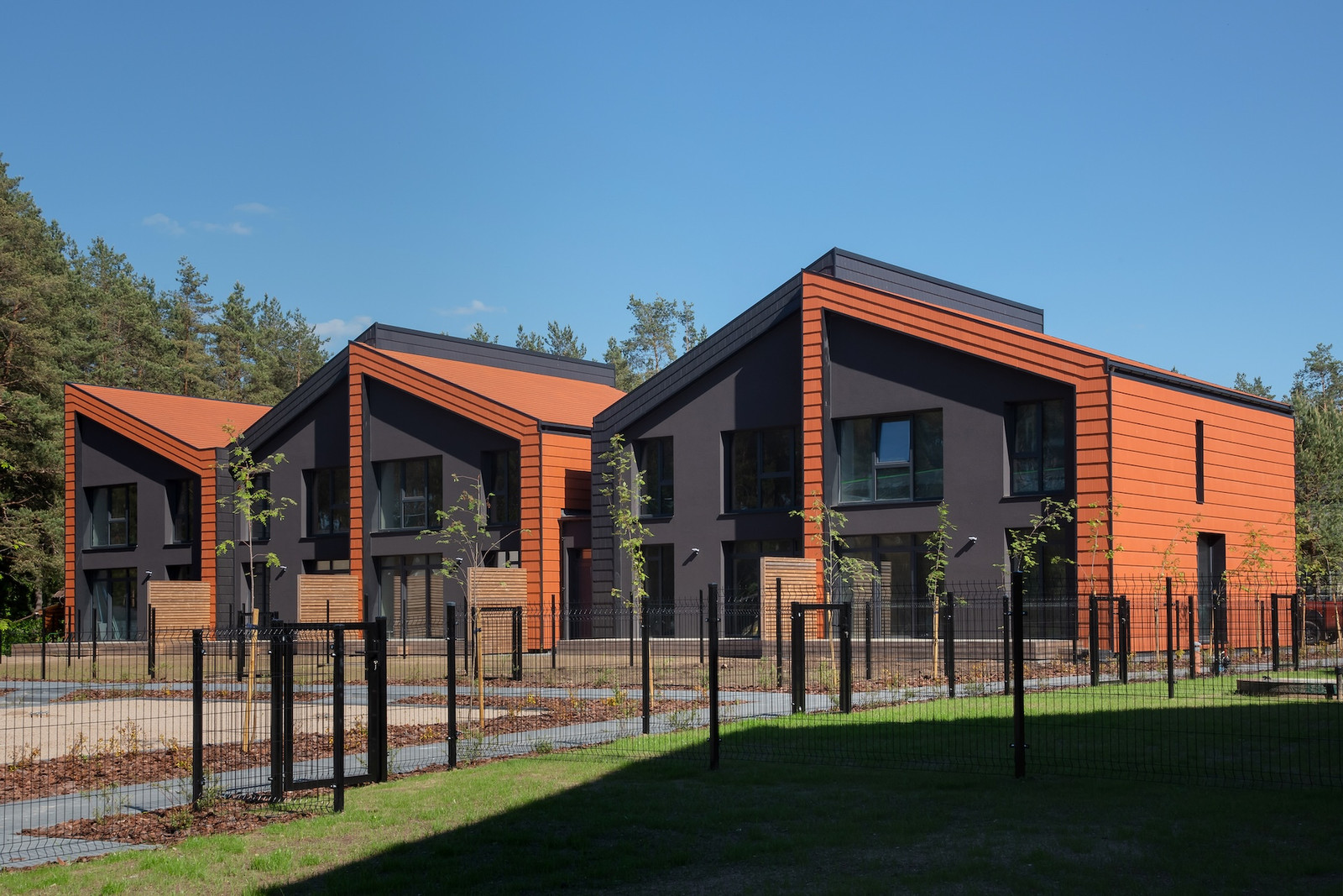 Projektui unikalumo suteikia inovatyvūs statybų sprendimai: namų fasaduose ir stoguose naudojamos dviejų spalvų - juodos ir molio - keraminės vokiškos čerpės suteiks namams ilgaamžiškumo, o gamtos unikalumą Jūsų interjere pabrėš medinio profilio, antracito spalvos vitrininiai langai, atveriantys pušyno žavesį.