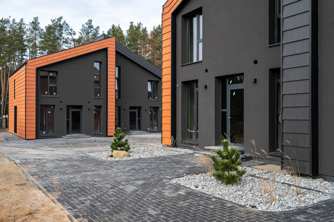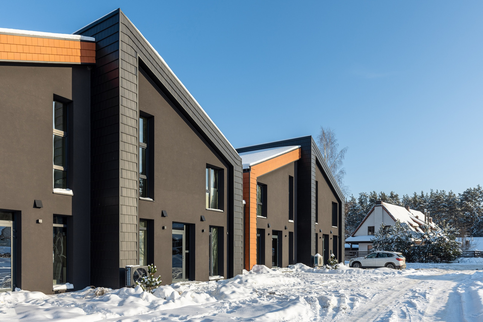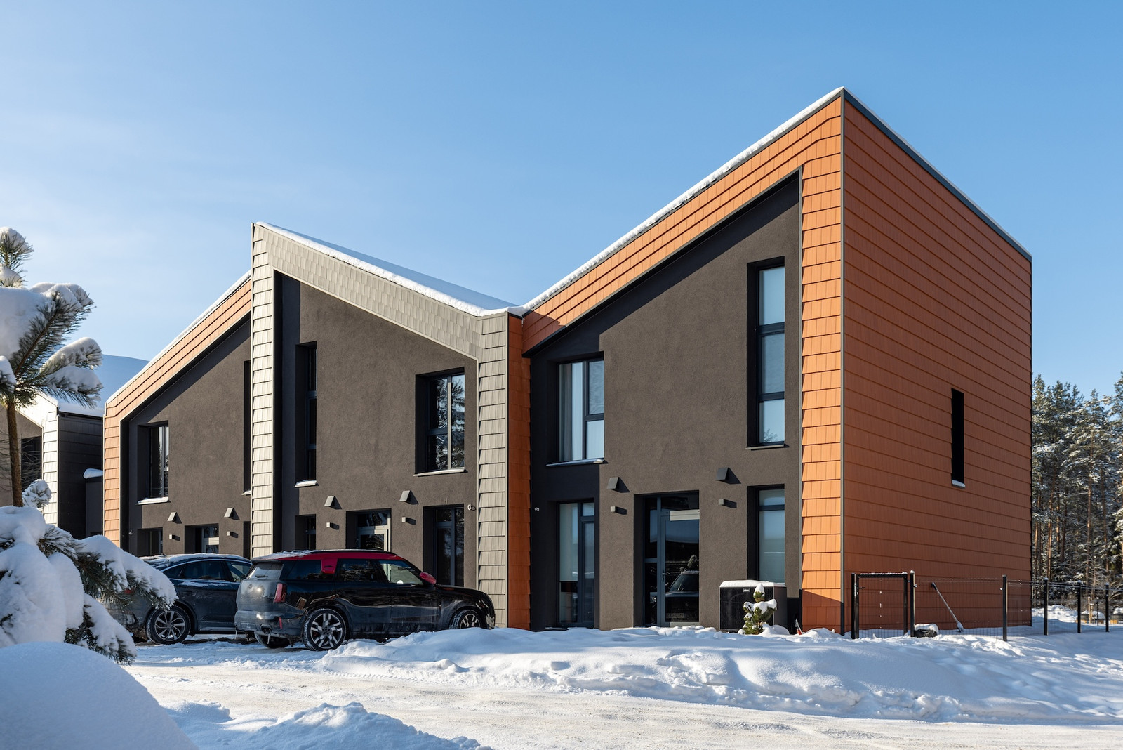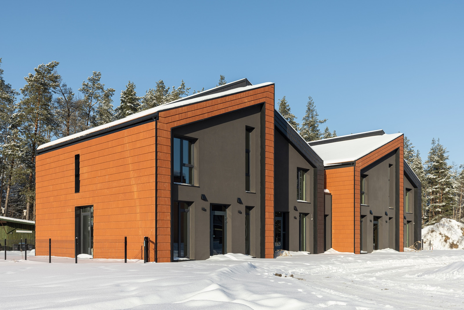 Projektui unikalumo suteikia inovatyvūs statybų sprendimai: namų fasaduose ir stoguose naudojamos dviejų spalvų - juodos ir molio - keraminės vokiškos čerpės suteiks namams ilgaamžiškumo, o gamtos unikalumą Jūsų interjere pabrėš medinio profilio, antracito spalvos vitrininiai langai, atveriantys pušyno žavesį.