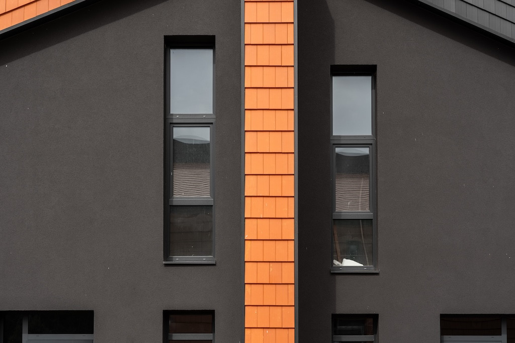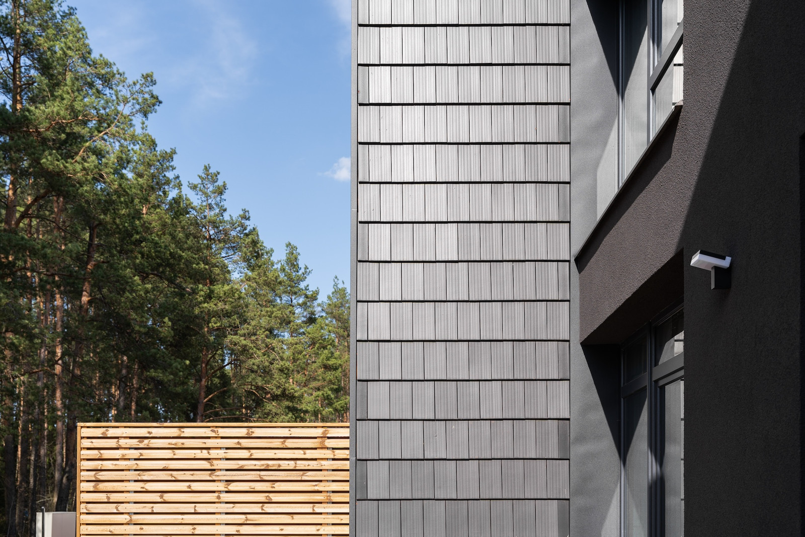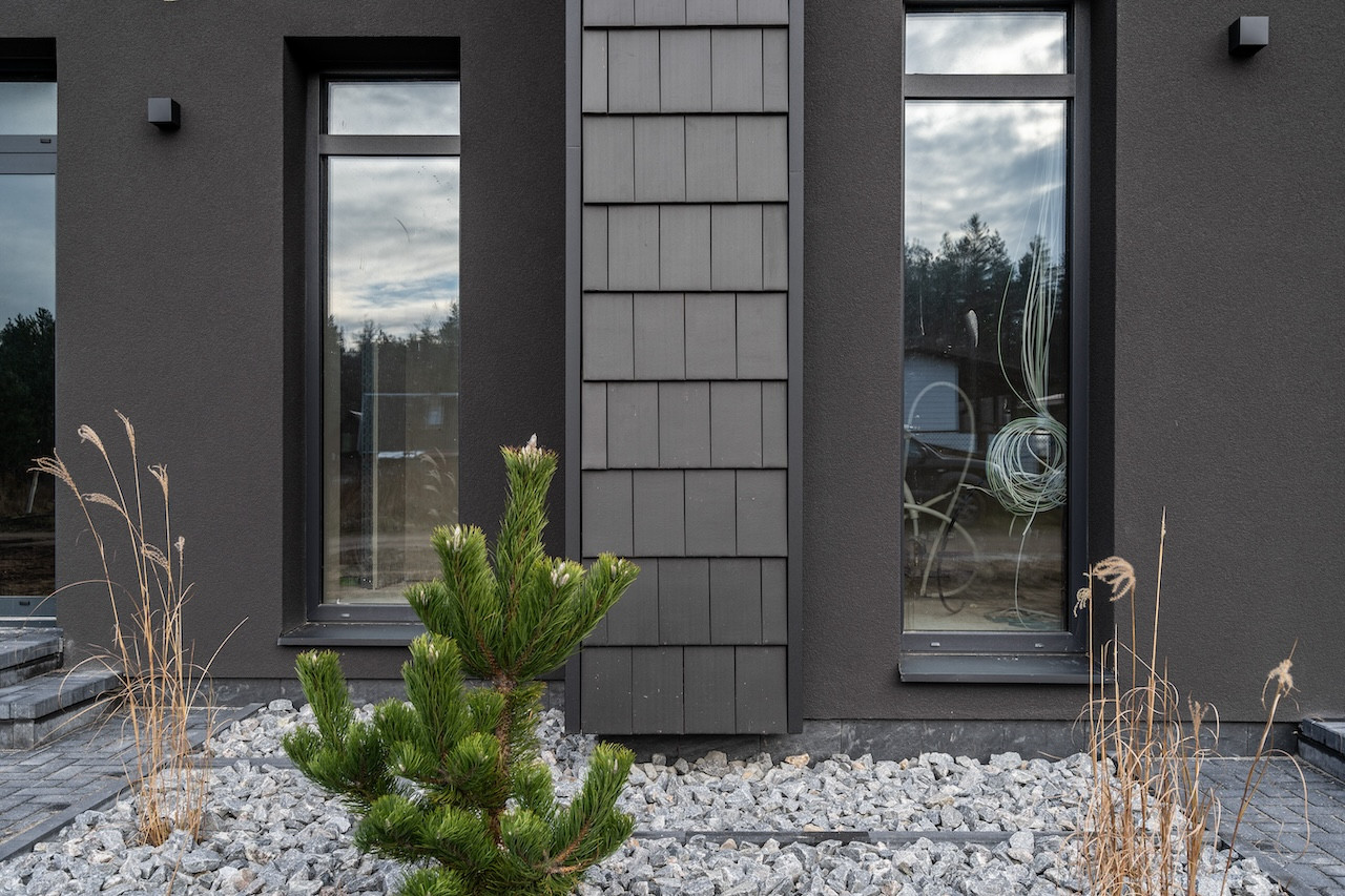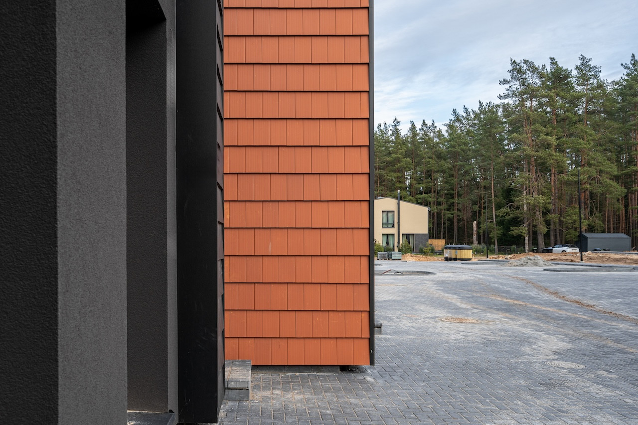 - fasado apdaila pagal architektūrinės dalies brėžinius - 2 spalvų (juodos ir molio) vokiškos technologijos keraminės čerpės; dalis fasado - juodo dekoratyvinio tinko;