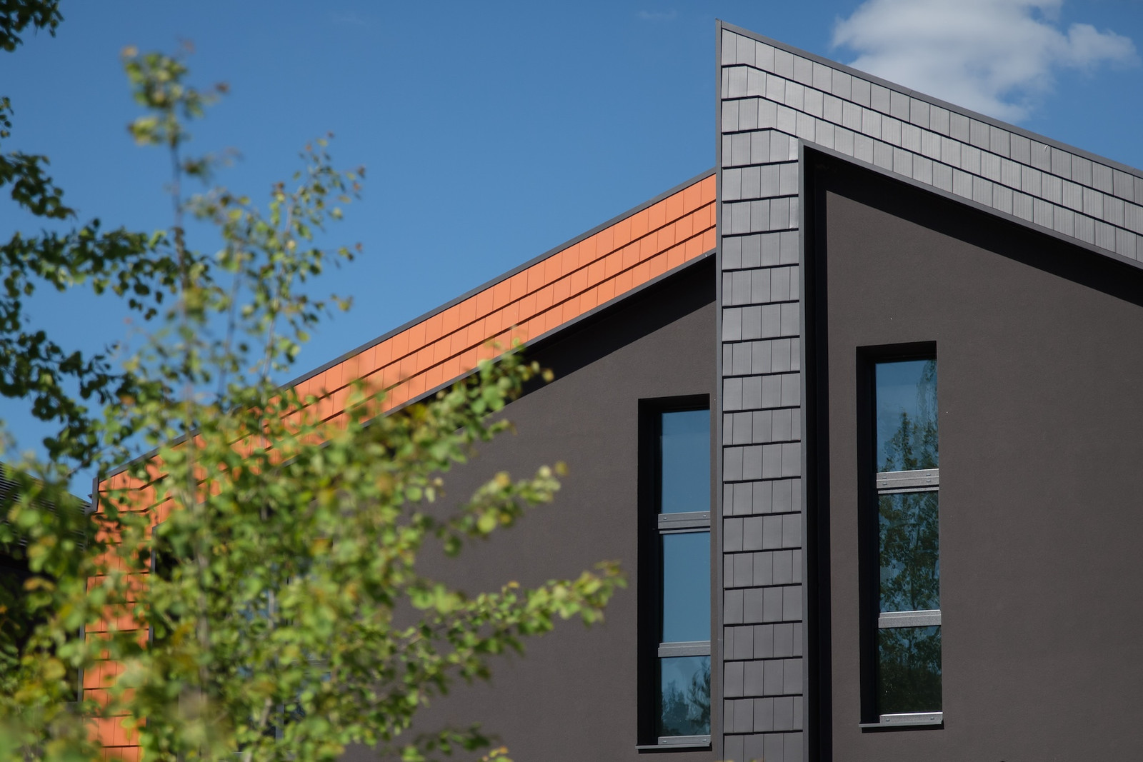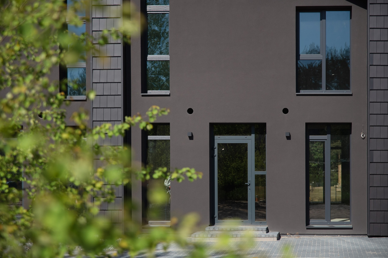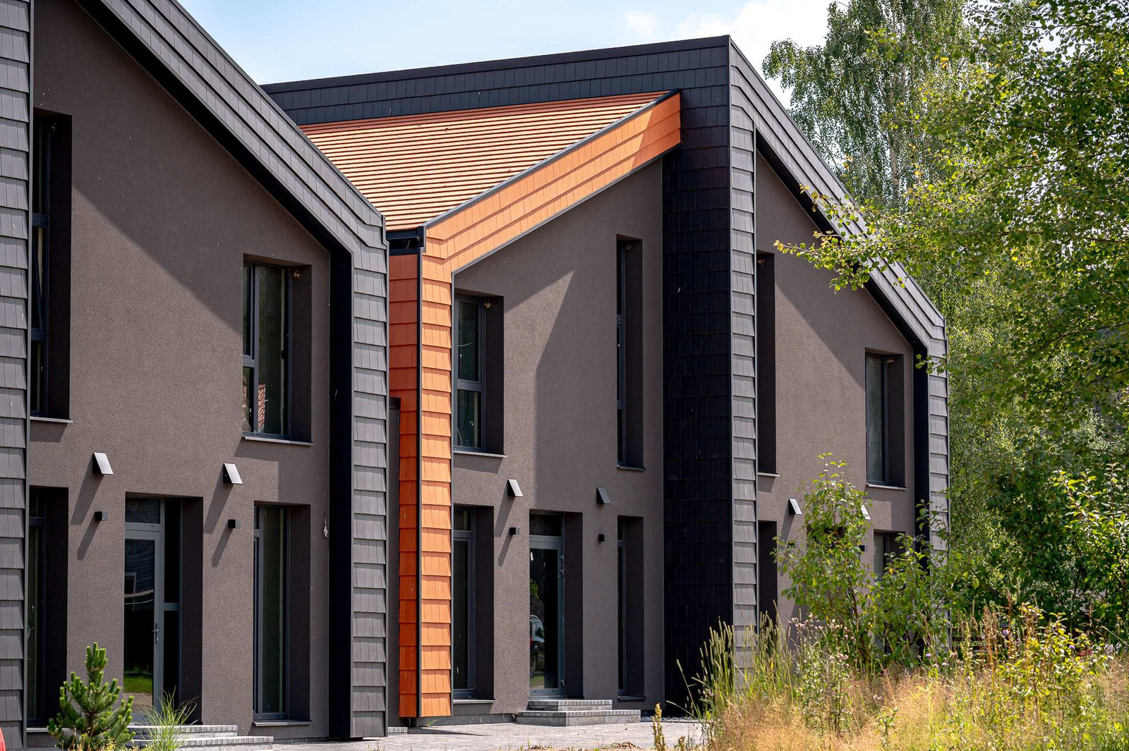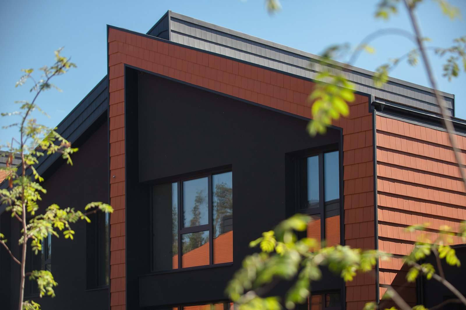 - fasado apdaila pagal architektūrinės dalies brėžinius - 2 spalvų (juodos ir molio) vokiškos technologijos keraminės čerpės; dalis fasado - juodo dekoratyvinio tinko;