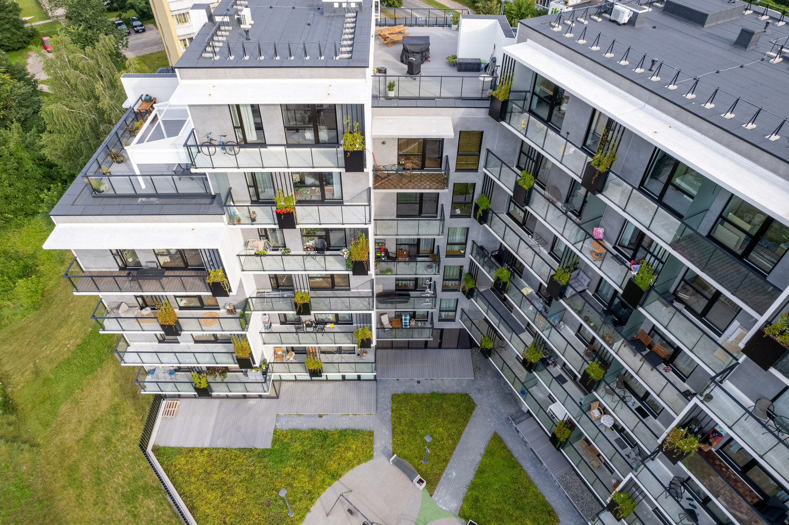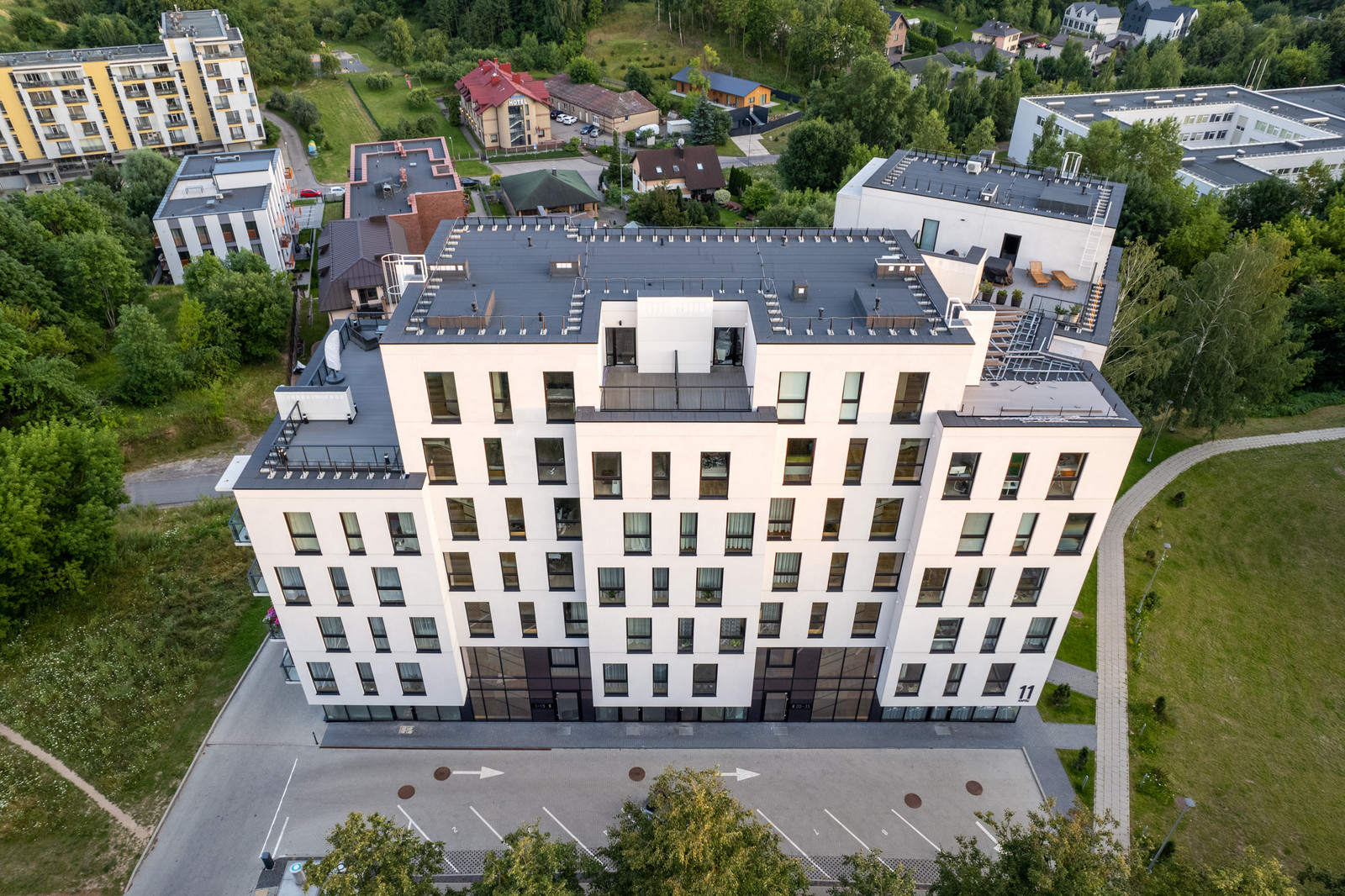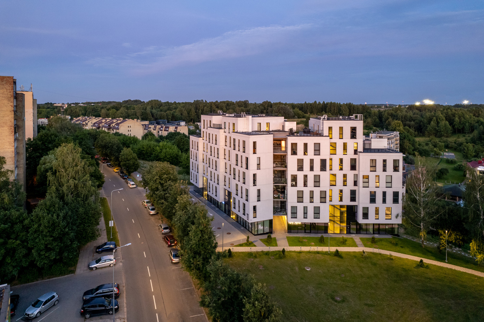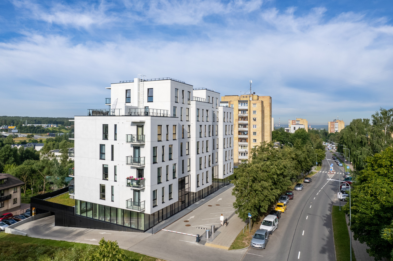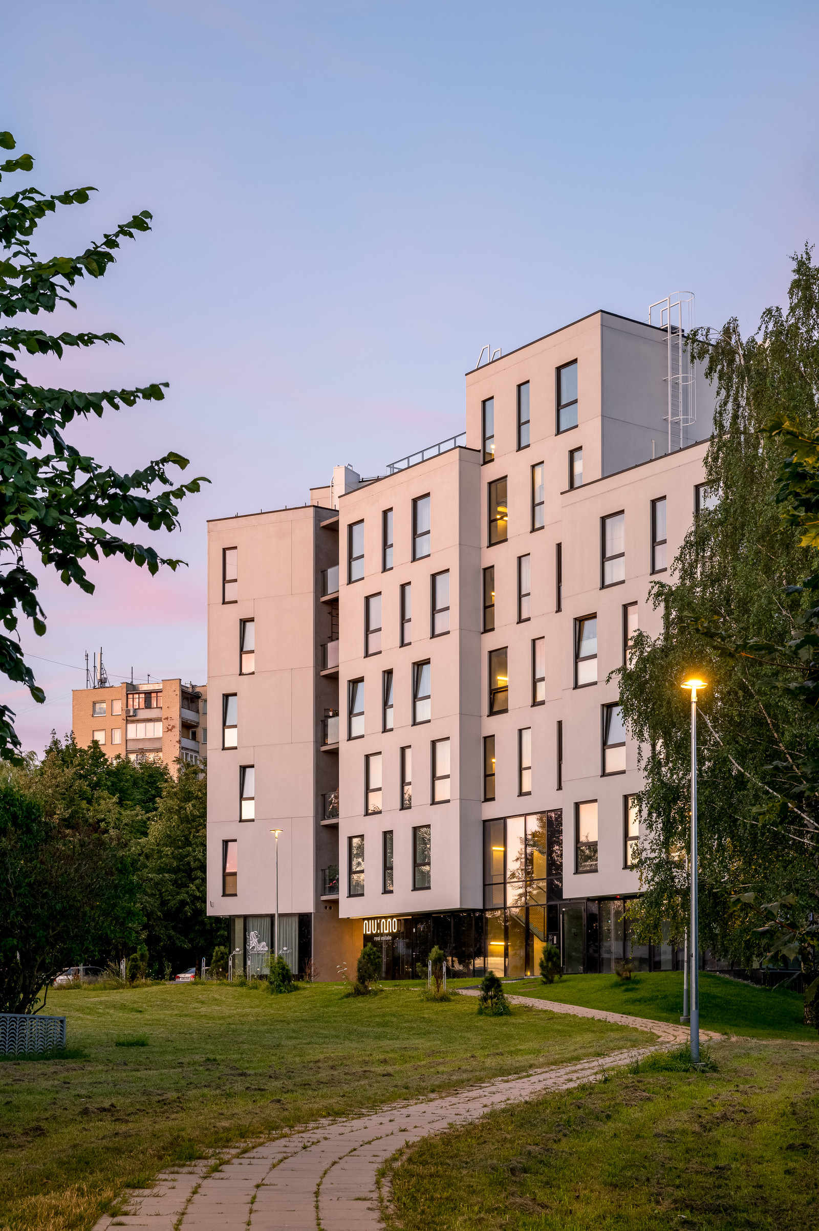 7 aukštų pastatas, 54 butai, 6 komercinės patalpos.
