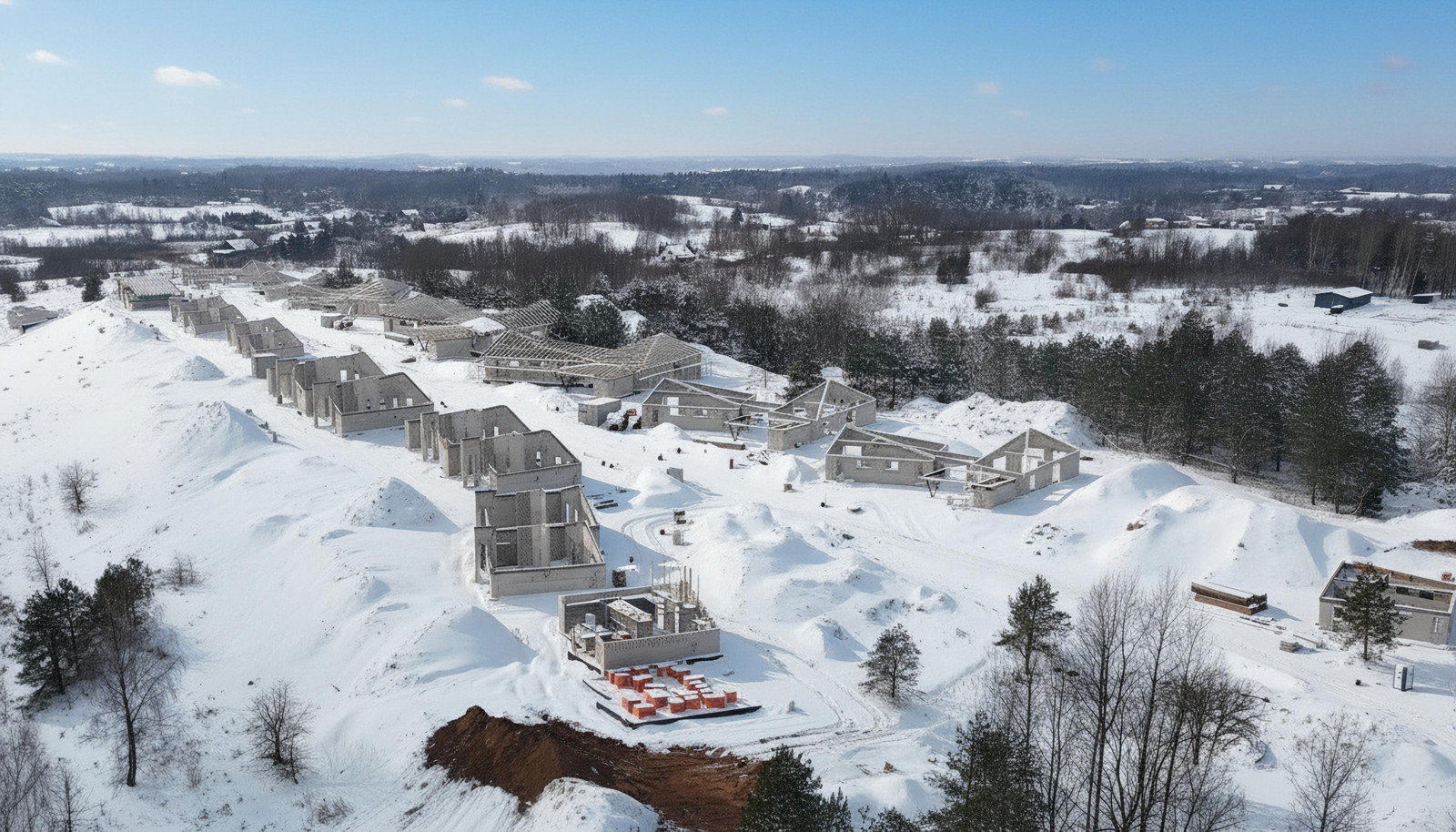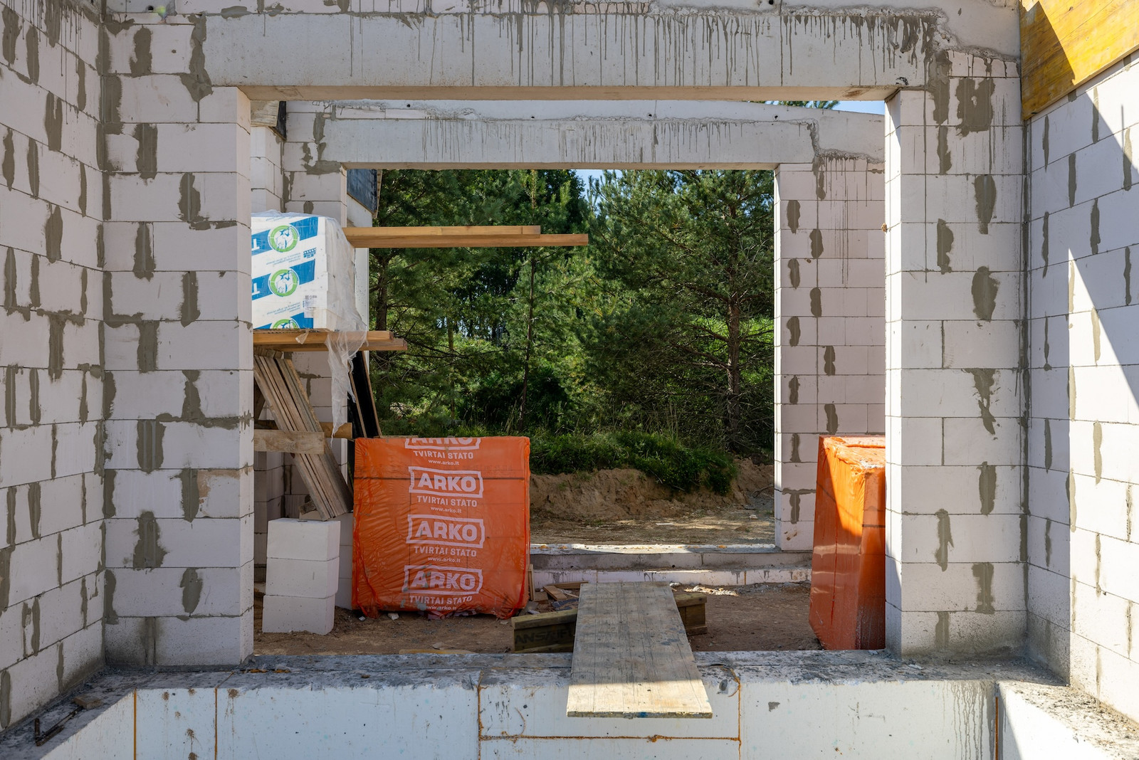 - Vidaus grindų betonavimas – grindys apšiltintos 200 mm storio polistireniniu putplasčiu, sumontuotas grindinis šildymas ir išbetonuotos ne mažesniu kaip 7 cm sluoksniu, paruoštos grindų dangai iškloti.