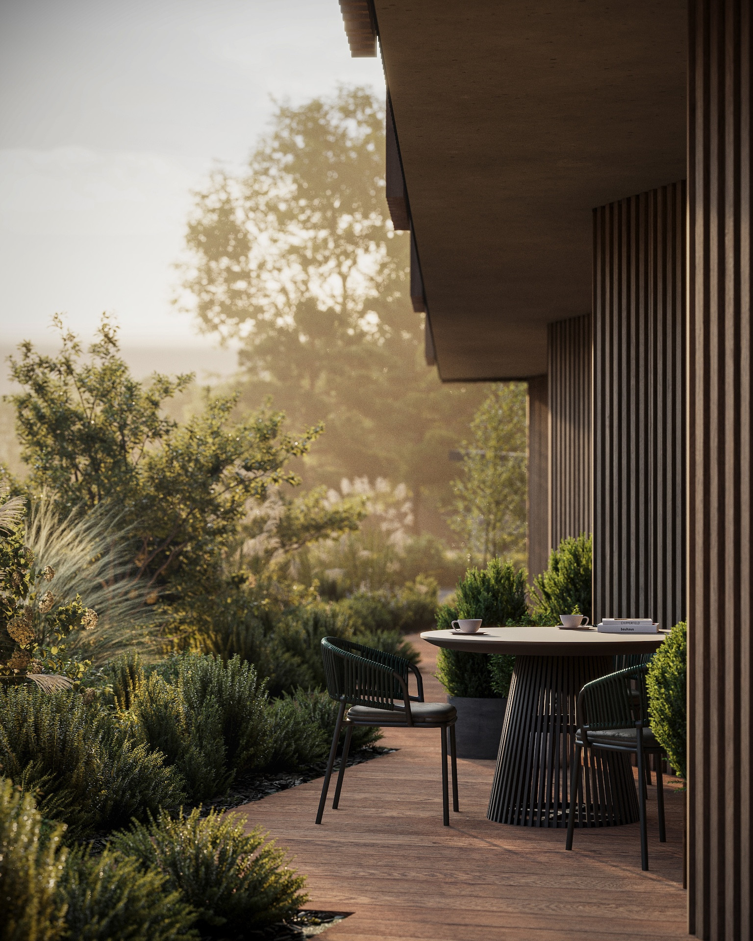 Projekto apželdinimas – kruopščiai suderinti augalai sukuria žaliuojančią, jaukią aplinką.
