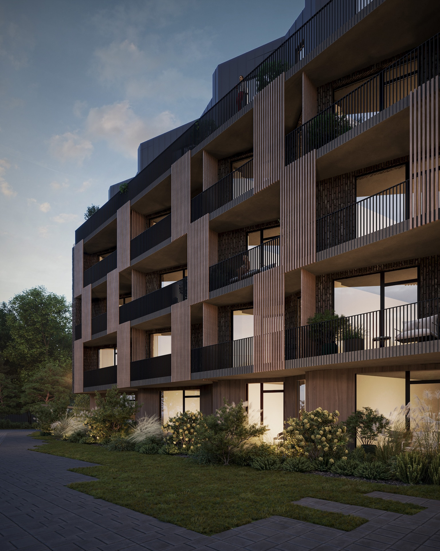 Visi apartamentai turi erdvius balkonus arba terasas.